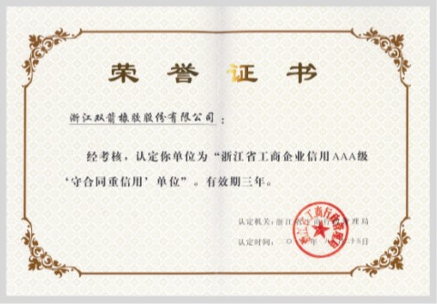 公司再次被續(xù)展認(rèn)定為“浙江省工商企業(yè)AAA級(jí)‘守合同重信用’單位”