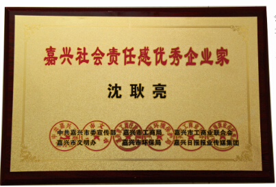 5月28日,在以“責任引領未來  共建誠信嘉興”為主題的嘉興市首屆“最具社會責任感企業(家)頒獎典禮上,一年多來,通過大眾網絡、報紙投票和組委會評議,認真篩選,層層選拔,最終誕生的嘉興最具社會責任感的企業和企業家以及優秀企業和企業家各10名受到了表彰。我公司董事長沈耿亮也獲此殊榮。